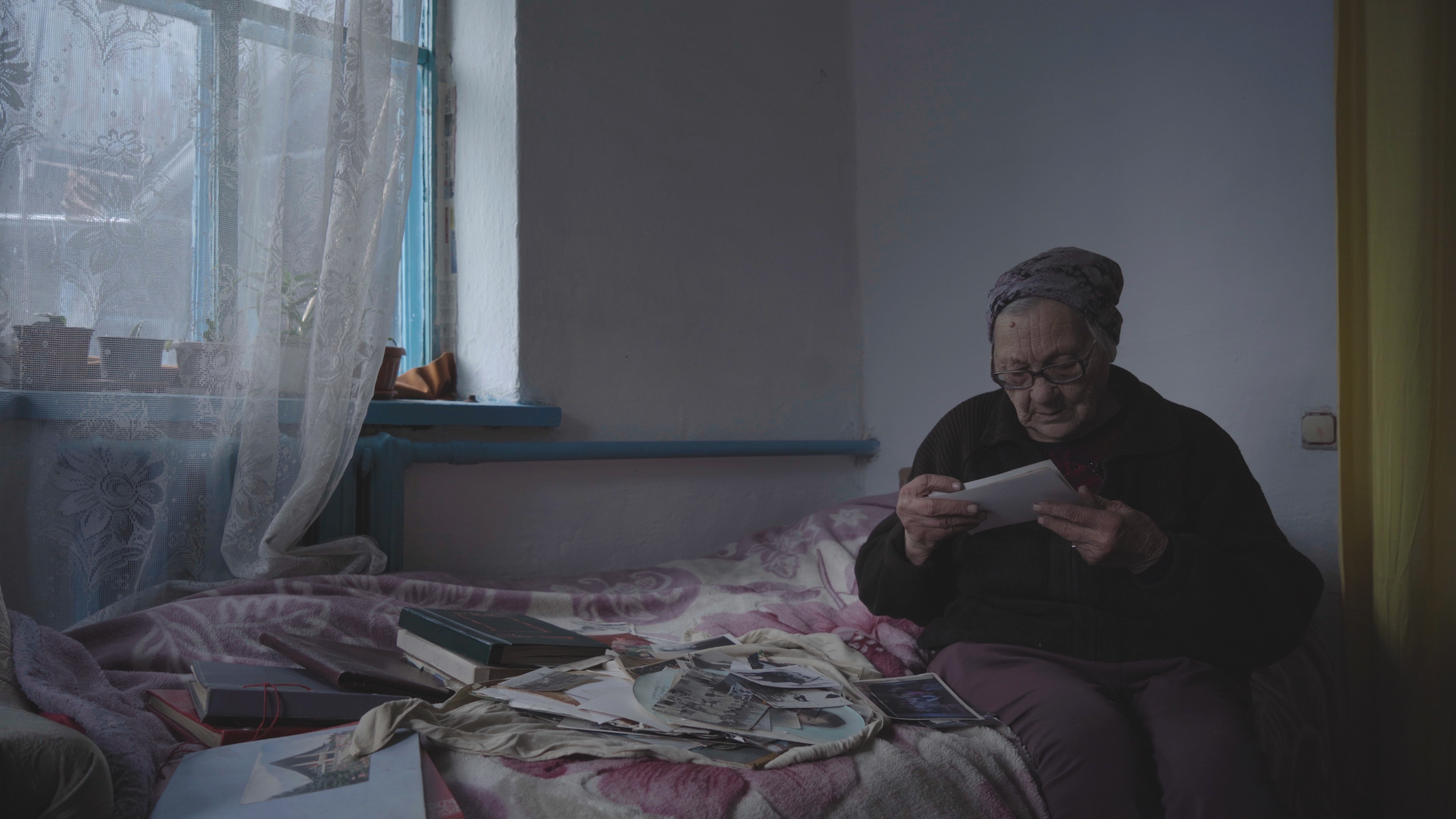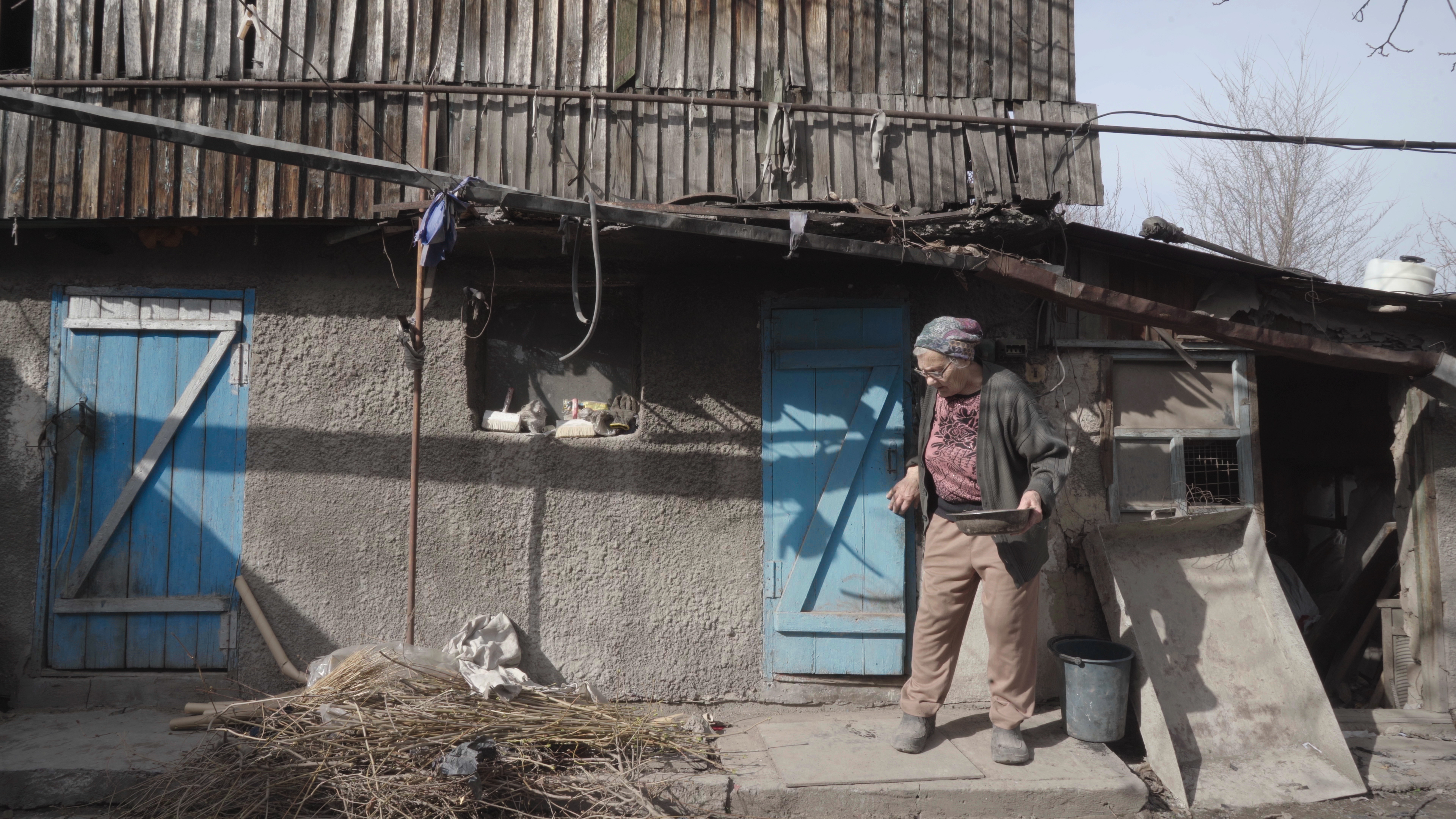 For several years now, Galina Petrovna has not left her house in Mayevka Village near Bishkek. There is a cozy blue house with fish garland in which a lonely grandma Galina tells us a story about her ghostly husband who died fifteen years ago. Every day she takes care of the house and even runs a small business. She sells chicken eggs and does laundry for some of her neighbors in her own washing machine. In a house full of pets, Galina Petrovna tells us about her alcoholic husband, pain and a new life after his death.